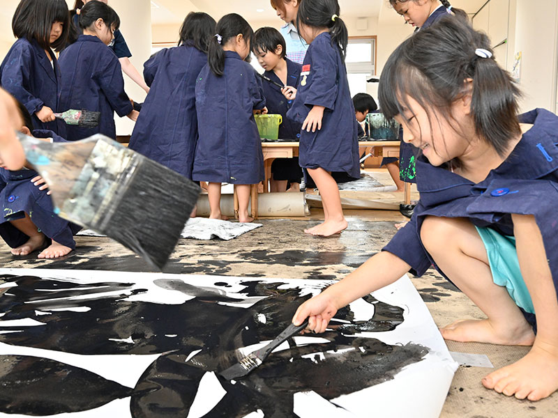 クレパス、水彩絵具(透明水彩)、墨、アクリル絵の具などを使用し、多種多様な制作活動を行います。また、美術講師自ら、上記の画材を含め、画用紙なども選んでいます。なぜならば、子どもたちが得る最初の感動をより大きくするためです。例えば、発色の良い紙に発色の良い絵具を使うことで、絵を描くことがもっと楽しくなるように、もっと表現したくなるように、制作物に合わせて画材を選定しています。